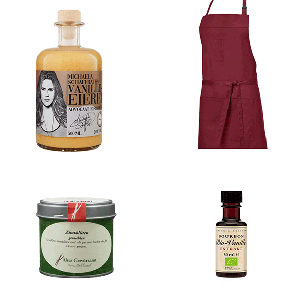 Die Vanille-EIEREI von Michaela Schaffrath schmeichelt mit echtem Bourbon-Vanilleduft und cremiger Textur – perfekt zum Dessert oder für den kleinen Schluck zwischen zwei Plätzchen. Die Zimtblüten vom Alten Gewürzamt bringen süße, blumige Wärme in Kekse, Bratäpfel oder heißen Punsch. Der Bio Vanille-Extrakt von Taylor & Colledge verleiht jedem Teig Tiefe und Seele – natürlich, edel, aus echten Madagaskar-Schoten. Und die weinrote Jobeline-Schürze sorgt dafür, dass du beim Backen aussiehst wie ein Profi und dich fühlst wie Oma Martha in ihren besten Zeiten.